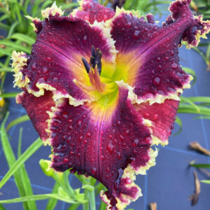Dark red with watermark, and creamruffled picotee above gold to green throat